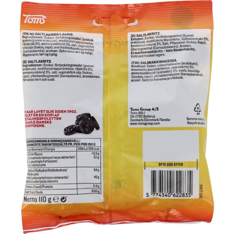 Sukker, fortykningsmiddel (arabisk gummi/gummi arabicum), modificeret majsstivelse, rålakrids 5%, ammoniumklorid 3%, salt, vegetabilsk olie/olje (kokos, raps) overfladebehandlingsmiddel (carnaubavoks), aromaer,
