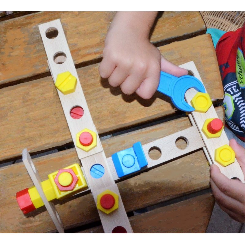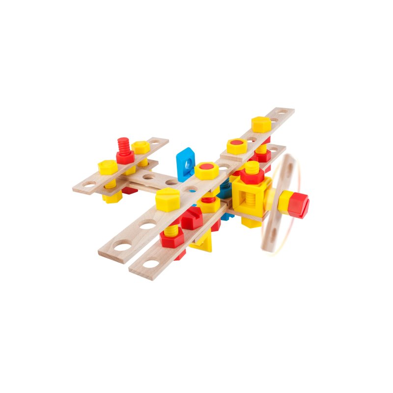 Tidløst bygselv legetøj til børn fra 4 år. Hvert sæt består af højkvalitets stykker af bøgetræ. Stærke farverige skruer og plastikmøtrikker,